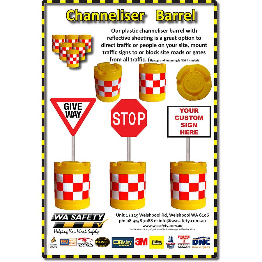 Channeliser Barrel with reflective tape Our plastic channeliser barrel with reflective sheeting is a great option to direct traffic or people on your site, mount traffic signs to or block site roads or gates from all traffic. (Signs and mounting NOT included) |